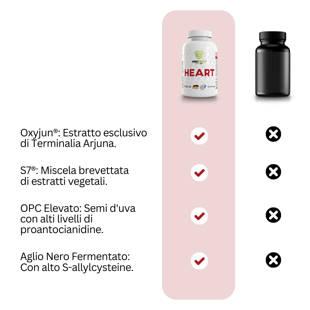 Non c'è bisogno di diversi prodotti singoli e costosi: Protect Heart ti offre il coenzima Q10, la nattochinasi, l'estratto di semi d'uva e altri principi attivi naturali, tutto in un unico prodotto.